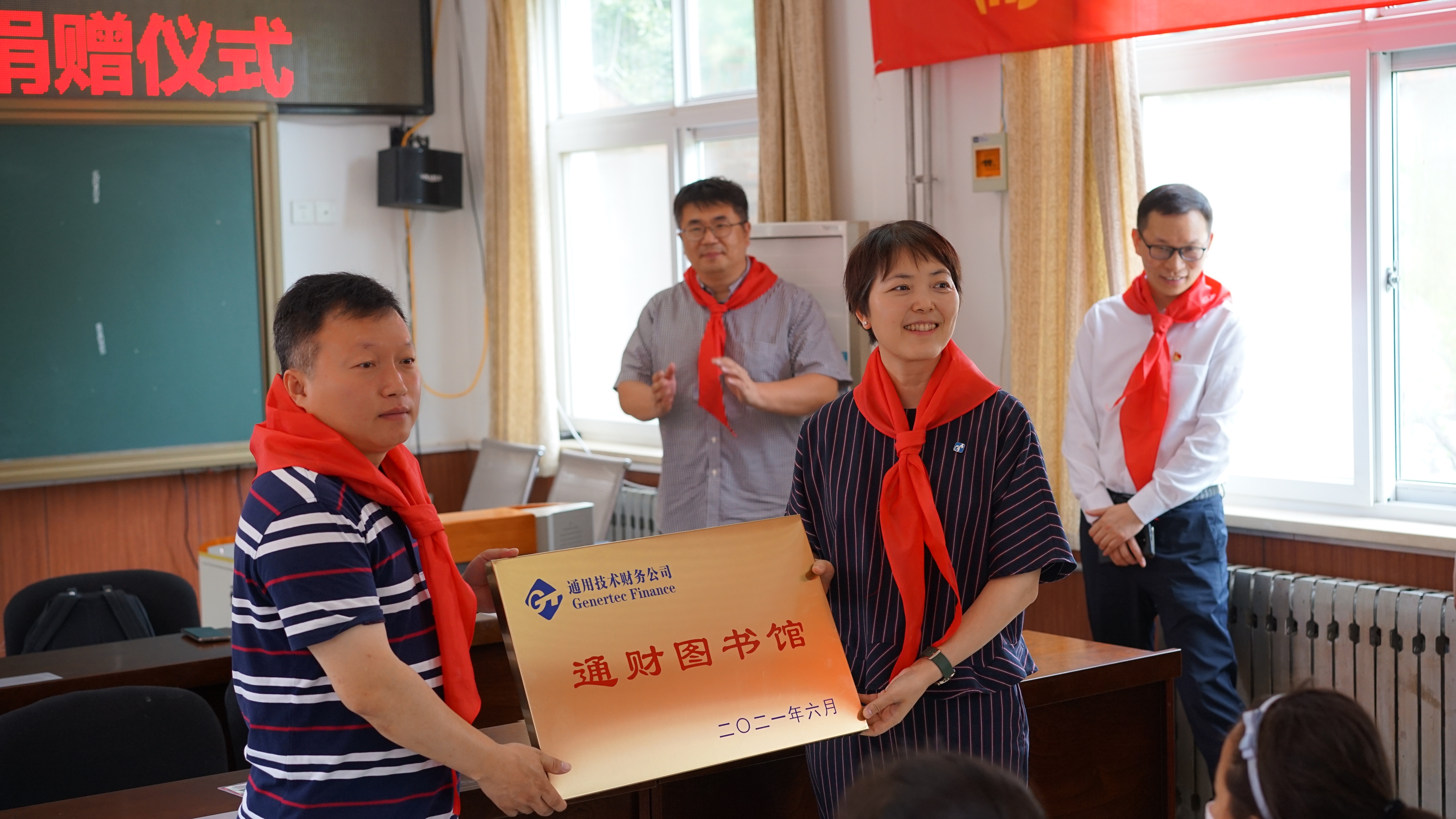 捐赠仪式上,斋堂中心小学少先队队员为参加活动人员佩戴了红领巾。双方举行了现场捐赠、“通财图书馆”揭牌仪式并合影留念。