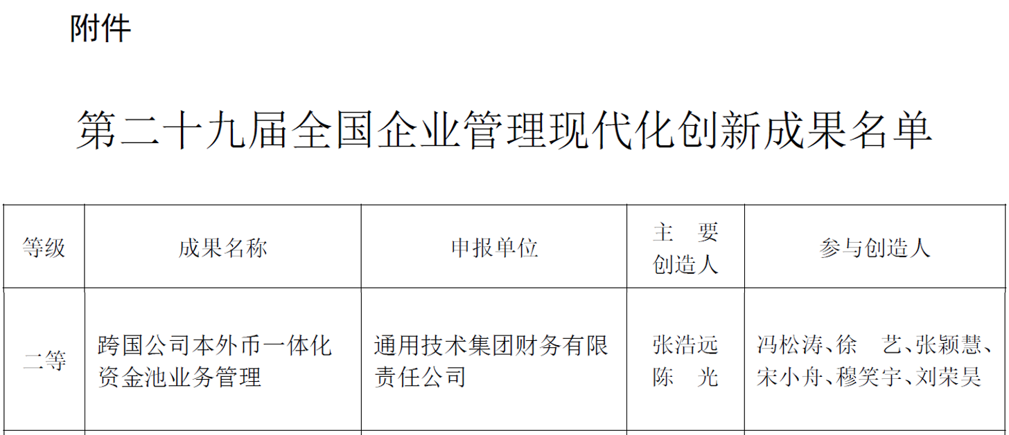 近日,根据全国企业管理现代化创新成果审定委员会(以下简称全国审委会)发布通知,通用技术财务公司《跨国公司本外币一体化资金池业务管理》荣获“第二十九届全国企业管理现代化创新成果”二等奖。