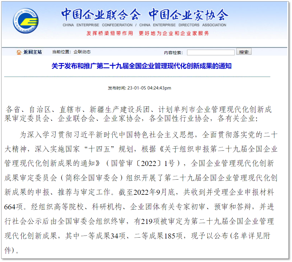 根据《关于组织申报第二十九届全国企业管理现代化创新成果的通知》(国管审〔2022〕1号),全国审委会组织开展了相关申报、推荐与审定工作,共收到并受理企业申报材料664项。经组织高等院校、科研机构、企业团体有关专家初审、预审和答辩,并进行社会公示后由全国审委会组织终审,有219项(约占申报总数的1/3)被审定为第二十九届全国企业管理现代化创新成果,其中一等成果34项、二等成果185项。