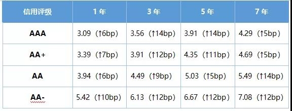 中债中短期票据AAA曲线5Y收益率上行0.33BP至3.9549%,中债企业债AAA曲线5Y收益率上行0.28BP至3.9554%,城投债AAA曲线5Y收益率上行5.45BP至4.0067%。