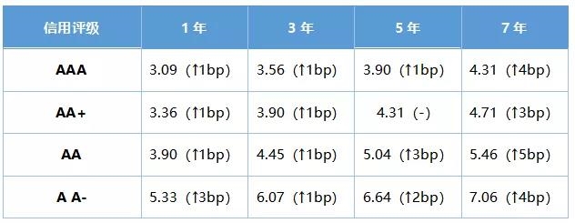 中债中短期票据AAA曲线5Y收益率上行9.38BP至3.9667%,中债企业债AAA曲线5Y收益率上行9.38BP至3.9668%,城投债AAA曲线5Y收益率上行13.08BP至4.0109%。